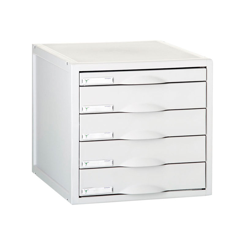 Módulo de 5 cajones pensados para dar un servicio total de almacenamiento de todo tipo de información y documentación. 4 cajones de 52mm y 1 cajón de 22mm. Todos los cajones incluyen tarjetero identificador. Dimensiones: 356x316x303mm.
