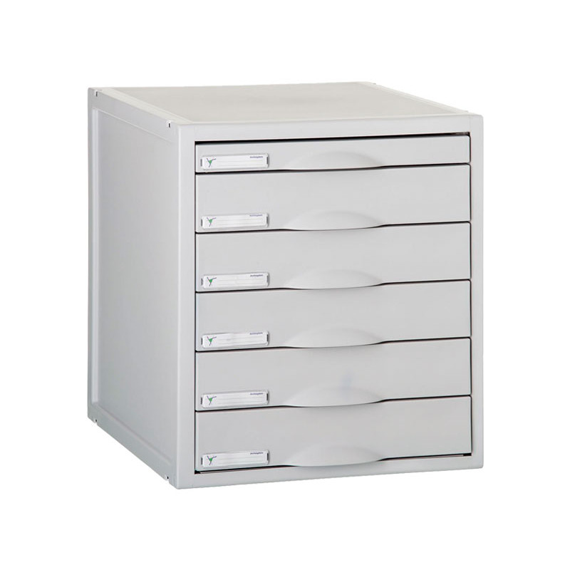 Módulo de 6 cajones pensados para dar un servicio total de almacenamiento de todo tipo de información y documentación. Todos los cajones incluyen tarjetero identificador. Dimensiones: 356x316x303mm.