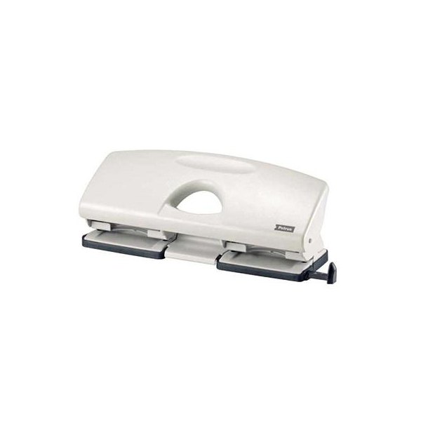 4 taladros. Muy resistente, capacidad de 25 hojas. Color gris claro. Diez años de garantía.