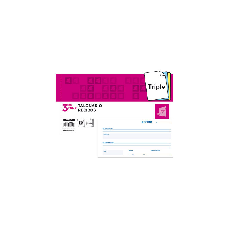 Talonario liderpapel recibos 3/fº apaisado original y 2 copias sin matriz.